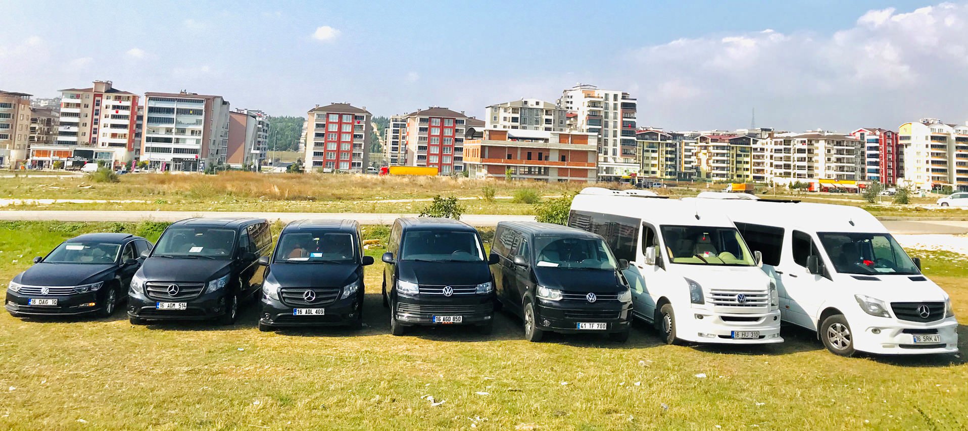 4+1 Volkswagen Passat, 8+1 Volkswagen Caravelle, 8+1 Mercedes Benz Vito, 9+1 Mercedes Benz Vito, 16+1 Mercedes Benz Sprinter, 19+1 Volkswagen Crafter, 27+1 Otokar Sultan, 46+1 Mercedes Benz Travego